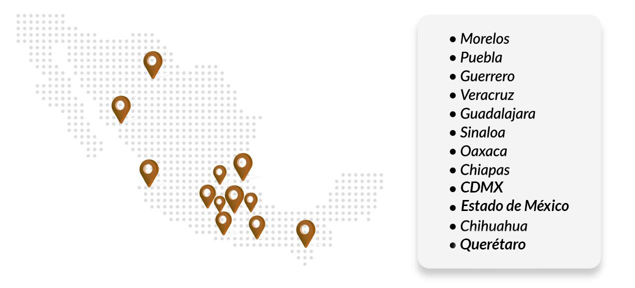 Nuestra experiencia y compromiso nos han permitido llegar a diversos estados del país, consolidándonos como un aliado confiable en materia de seguridad integral.